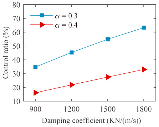 The quasi-static displacement control ratio is calculated and presented in Figure 13. It can be seen that the control performance of the fluid viscous damper is not satisfactory, although the control ratio increases. The control ratio slightly increases when the damping coefficient increases from 900 to 1800 kN/(m/s), and the control ratio increases significantly when the power parameter decreases from 0.4 to 0.3.