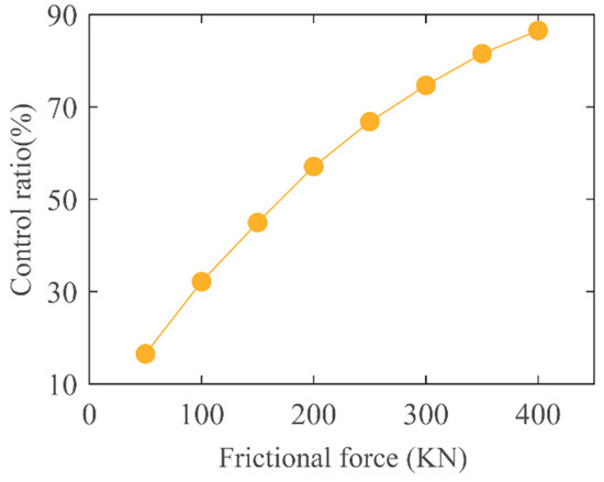 The control performance calculation of the friction damper to quasi-static displacement is conducted. In this case, the Coulomb friction force ranges from 50 kN to 400 kN. The control ratio is presented in Figure 15. It can be seen that the friction damper is demonstrated to alleviate the excessive cumulative longitudinal displacement significantly. The control ratio increases to 86.59% when the Coulomb frictional force is set to 400 kN.