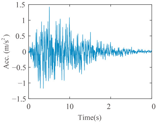where the time-dependent circular frequency of the site soil , the time-dependent damping ratio of the site soil , is the duration of the seismic excitation, which is set to 30 s, is the intensity modulation function with , is the time-varying intensity of the power spectrum in which the mean peak ground acceleration (PGA) , and its corresponding peak factor . Based on the non-separable EPS, a seismic excitation is generated and presented in Figure 17. The duration of the acceleration time history is 30 s, and the time step is 0.02 s.