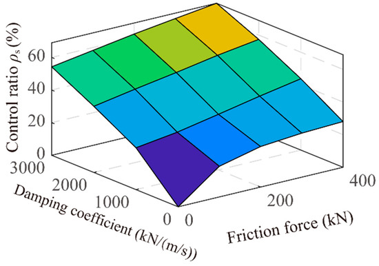 In this case, the damping coefficients were set to 0, 1000, 2000, and 3000 kN/(m/s), and the power parameter was set to 0.4. Moreover, the friction force was set to 0, 100, 200, 300, and 400 kN. The quasi-static control ratio response surface is obtained in Figure 16. It can be observed that the control ratio increases with the increment of the damping coefficient and friction force. Furthermore, the friction damper dominates in controlling quasi-static displacement.