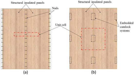 Top view schematics of the unit cell of the SIP wall connected by (a) surface spline and (b) embedded camlock systems.