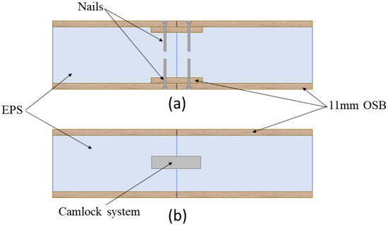 The SIP used in the experimental work of Qiang Du and his colleagues [18] was made of 143 mm of an EPS sandwich between two layers of OSB with a thickness of 11 mm. The total thickness of the SIP wall samples was 165 mm. They first examined a single SIP without any joints. The second sample was a SIP wall with a joint in the middle of the SIP wall. The SIPs were connected by a surface spline joint. The dimensions of the nails used in the surface spline joints were 3.2 mm in diameter and 60 mm in length, with a constant spacing of 150 mm as outlined in the international building code [21].