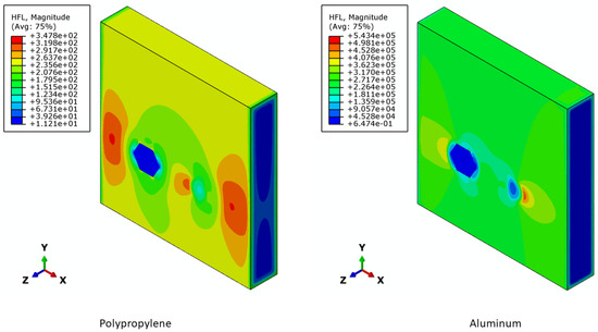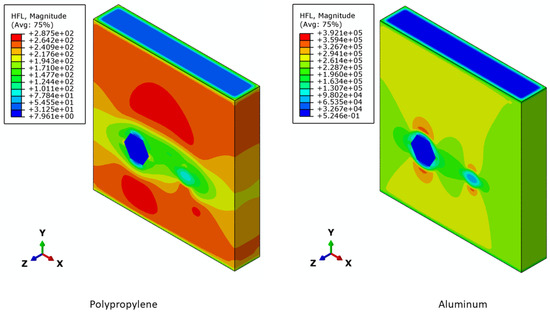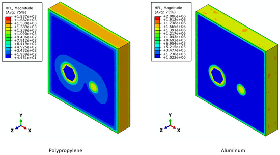 The orthotropic thermal conductivity values of the camlock model were predicted by repeating the steady-state thermal analysis along all three directions (X, Y, and Z). Similar thermal conductivities are expected in the X- and Y-directions as the structure of the camlock model is similar along both these directions. Table 2 summarizes all the resulting thermal conductivities derived from the camlock model for the six different materials with varying thermal conductivities. Polypropylene has the lowest thermal conductivity, three orders of magnitude lower than aluminum, with the highest thermal conductivity. Figure 5, Figure 6 and Figure 7 present the heat flux contour maps of the camlock model with polypropylene and aluminum in the X-, Y-, and Z-directions, respectively. Similar to thermal conductivity, the heat flux flowing in the polypropylene camlock model is three orders of magnitude lower than aluminum.