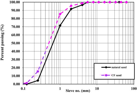 Passing percentage of aggregates utilized (natural and CF sand).