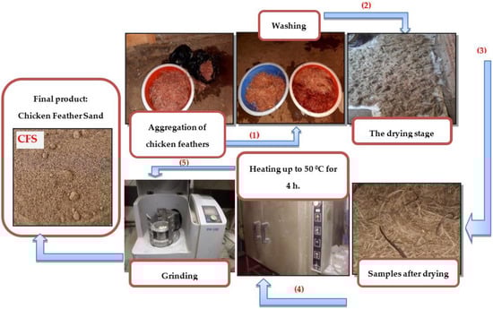 For this investigation, one form of CFS was proposed. To increase the strength of the mortar mixes, CFS was added. The discarded chicken feathers were provided by poultry farms. The combustion of such waste can contaminate the air and endanger the ecosystem. Before casting cement with CFS as a sand replacement, the feather surface must be cleansed to remove dirt and other unwanted particles. To remove blood, discarded feathers were taken in bags to the laboratory and washed many times with water. The clean feathers were then spread out on sheets to dry for five days in the sun, as shown in Figure 2, and they were not chemically treated. An electric oven was then used to roast the samples at a temperature of 50 °C for four hr. before being crushed in a commercial electric grinder. Table 1 lists the physical and mechanical characteristics of chicken feathers, and Figure 2 depicts the steps for chicken feather sand preparation.