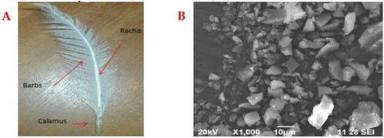 (A) Photograph of a chicken feather showing rachises and barbs. (B) SEM image of chicken feather sand [,].