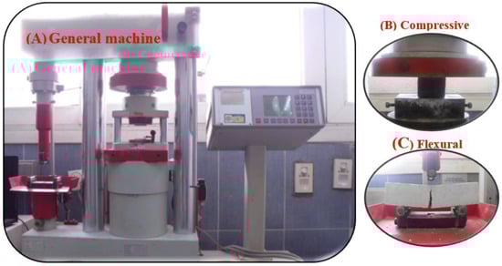 View of testing: (A) machine, (B) compressive strength, and (C) flexural strength.