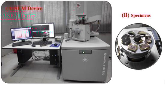 The view of (A) scanning electron microscopy (SEM) device; (B) specimens.
