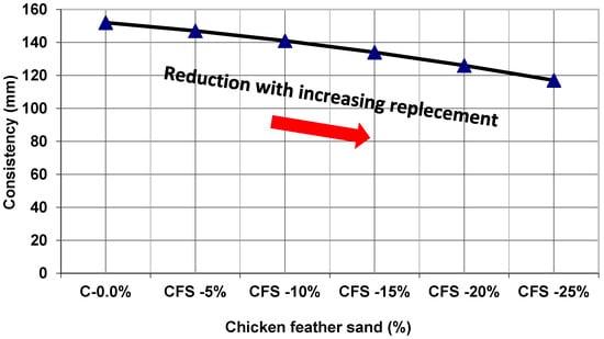 In this study, mixtures were prepared with a constant water-to-cement ratio (W/C) of 0.4 and replacement ratios of CFS of 5%, 10%, 15%, 20%, and 25%. Furthermore, when compared to the control sample, a higher replacement of CFS resulted in a lower workability for the same quantity of water, as represented in the consistency value of the blended cement paste, as shown in Figure 6. These findings are comparable with those of Abishek et al. []. The CFS-5%, CFS-10%, CFS-15%, CFS-20% and CFS-25% mixtures had approximately 3.29%, 7.24%, 11.48%, 17.11%, and 23.03% lower consistencies than the control mixture, respectively. The reduced water requirement of CFS is due to the substance’s ability to absorb water when compared to natural sand, as well as the microstructure of the substituted mixtures [,]. Because a high replacement ratio requires the use of more water to achieve a specific consistency, more water is required to maintain that consistency. On the other hand, low replacement ratios are ineffective at this time. This conclusion was consistent with the findings of other studies, see Figure 6 [].