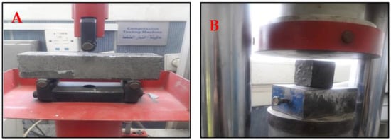 Eighteen tests were conducted to determine the consistency of the fresh mortars. Thirty-six cube specimens with dimensions of 70 × 70 × 70 mm were prepared and cured to conduct compression tests after 7 and 28 days, respectively, as shown in Figure 4, while flexural strength tests were conducted using eighteen prismatic specimens with dimensions of 40 × 40 × 160 mm and tested using a three-point testing device at a curing age of 28 days, as shown in Figure 4. All tests were carried out in accordance with the BS EN 196-1 standard [].