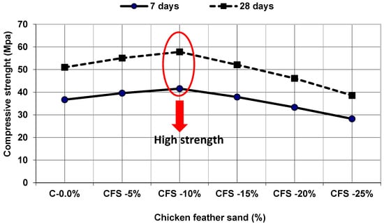 Figure 10 depicts the compressive strength values of CFS mixes depending on the amount of CFS replacement. The CFS-10% combination attained the ultimate compressive strength. The increase in compressive strength at 7 days was found to be highly apparent in comparison to the increase in compressive strength at 28 days, which ranged from 2.16% to 13. 33%. The usage of CFS from 5% to 15% of a fine aggregate contributed significantly to the compressive strength values. As a result, the inclusion of 10% CFS as the optimal replacement ratio resulted in a 41.58 MPa compressive strength at 7 days and 57.8 MPa compressive strength at 28 days [,,].