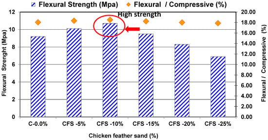 The relationships between flexural strength and flexural/compressive strength (%) depending on the replacement percentage.