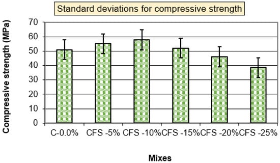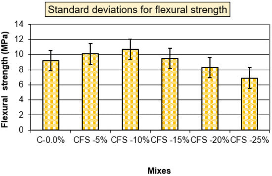 Figure 11 shows the flexural strengths of mixtures with and without replacement, as well as the flexural/compressive (F/C) ratios. According to the findings of this study, using CFS in specific amounts greatly enhances flexural strength. Mechanical characteristics were reduced with a 15% CFS replacement. The compressive strength increases with a stronger matrix, and high flexural strengths can be achieved []. It is assumed that at a certain level of CFS (10% by weight), the weak bonding capability of CFS diminishes the adhesive strength with paste, resulting in low mechanical properties, as documented in the literature [,]. The F/C ratios ranged between 18.51% for the CFS-10% mixture and 17.88% for the CFS-25% mixture. The CFS replacement in mortar improved mechanical properties such as the compressive strength, flexural strength, and other properties, and this result is in agreement with the reference [,]. Figure 12 and Figure 13 show the standard deviations for compressive and flexural strengths.
