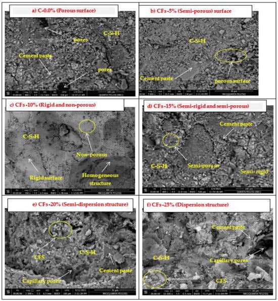 The micrographs of the CFS mortar are shown in Figure 14. According to Figure 14, the structure of the CFS particles varied. The surface texture and shape of the mortar varied due to the replacement ratios. The densification of the particles is influenced by grade 50 MPa mortar, as shown in the microstructure (Figure 14a–d). The surfaces of the CFS-5%, CFS-10%, and CFS-15% mixtures are rigid and nonporous, but the surfaces of the CFS-20% and CFS-25% mixtures are porous. This rigid surface may contribute to a better strength (Figure 14b–d), while the porous surface provides a lower strength (Figure 14e,f) due to the dispersion structure [,]. The surfaces of the CFS-20% and CFS-25% mixtures are rigid, whereas the CFS-5%, CFS-10%, and CFS-15% mixtures have smooth surfaces. The high replacement of fine aggregates indicates a non-uniform dispersion of the fillers within the matrix [,]. The appearance of clusters is a clear indicator that the CFS agglomerated in the mortar at large replacement ratios (20% and 25%). In contrast, the surfaces of the CFS-5%, CFS-10%, and CFS-15% mixtures have fewer clusters. These findings suggest that the interfacial bonding is stronger between the CFS and mortar in low replacements [,,].