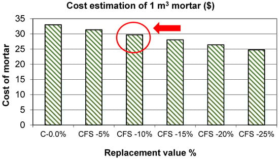 A cost comparison was performed, and it was revealed that replacing 15% of the sand costs the least and has the greatest impact on the project’s cost. However, according to this research, the optimal replacement is 10%, which reduces the cost of 1 m3 of mortar by 3.0% and simultaneously increases the strength, which is in accordance with references [,,].