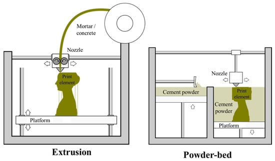 Two methodologies of 3D printing for construction have been widely developed which are extrusion and powder-bed 3D printing cement. The concepts of both processes are exhibited in Figure 2. Numerous researchers have analyzed these technologies’ influences and uses in the building industry [,,,,,,,,]. The AM structures were mainly printed as concrete wall components. The AM wall can be designed as a load-bearing wall or a non-load-bearing wall depending on the concrete mix design. The concrete mixtures were adjusted to have good flowability, printability, and sufficient strength. In construction, the size of AM wall panels is dependent on the printer’s size. Several AM wall panels may be required for manufacturing and then fabricated into a larger building. Even though these studies are vast, they tend to concentrate on particular elements of technology and its application. However, while there are studies addressing various elements of AM technology, current research lacks the systematization required to offer a comprehensive overview of all the DfMA processes. It is found that AM construction can be well adopted by using current prefabrication techniques.