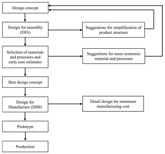 Boothroyd (1994) advocated that DfA should be the primary concern for product design, resulting in a simplified product structure. Next comes the economical selection of materials and procedures, and then preliminary cost estimation. To reach a trade-off choice, cost estimates for the original design and the new (or improved) design will be compared thereafter. Once the materials and methods have been finalized, a more complete DfM study will be conducted. DfM is provided with standards, component design, and component assembly for lowering the total cost of production. The general series of DfMA procedures are illustrated in Figure 3 (adapted from []).