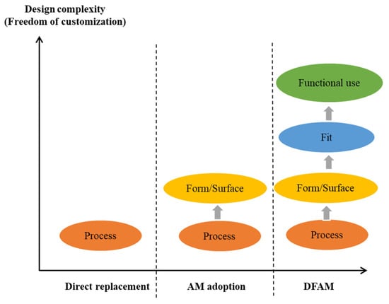 Figure 5 shows the complexity levels of DfAM techniques. Both direct component replacement and DfAM can be viewed as processes of manufacturing-driven and function-driven design strategies, respectively. The adaption of AM represents the medium ground between the two sides. To take advantage of AM, the design of a component can be modified, but its connections to other components are maintained in their previous states [].