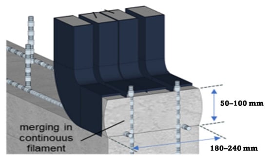 - AM is a good way to fabricate a structure with more than one material. The use of more than one material in AM can be applied to improve the functionality of the printed element. The multiple nozzle heads of extrusion AM have been examined [,,]. Classen et al. [] made fork-shaped, multi-nozzle extrusion heads for layer thicknesses of 50–100 mm and filament widths of 180–240 mm, as illustrated in Figure 7. The goal was to set up a fully automated, high-speed process for making continuously steel-reinforced concrete walls. Khoshnevis et al. [] introduced supporting material, such as wax and sand, along with the concrete nozzle. This can be adopted for better buildability and can be built as a roof structure. Aside from these, multi-nozzle AM can produce complicated structures such as concrete extruded nozzles and spraying nozzles for either smoothing the surface or creating a range of surface textures.