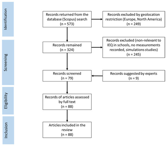 A total of 573 papers were identified. A geo-localization filter was applied as only studies in Europe and North America were included to ensure comparability across studies regarding climate conditions, surrounding environment, and building characteristics. Consequently, 324 articles were retained and used for screening. Non-relevant to IEQ measurements in schools, simulation studies, and studies based only on questionnaires were removed. This screening resulted in 79 papers. Nine additional papers were identified and added manually although they did not appear in the initial search. Finally, 88 papers were analyzed in this review. Figure 1 presents a PRISMA flowchart describing the paper selection. It should be noted that 11 studies in university classrooms were included in the review because universities are school environments, even though the students are young adults and no longer children.
