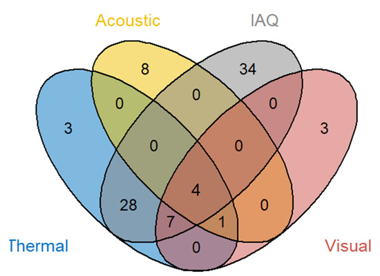 This review highlighted that out of the 88 reviewed articles, all four components of IEQ were measured only in four studies [27,28,29,30]. Identical parameters were measured in these four studies (air temperature, RH, CO2, illuminance, noise level), with a sample size of less than five classrooms in three studies. The study by de la Hoz–Torres et al. [29] measured IEQ parameters in 15 classrooms in six buildings in Portugal and Spain. As shown in Figure 2, eight studies measured at least three out of the four IEQ components—seven studies measured IAQ, visual and thermal parameters [25,48,49,50,63,66,74], and one study measured visual, thermal and acoustic parameters [43].