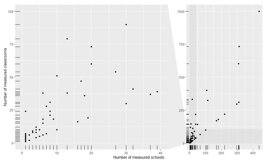 Number of schools and classrooms per study where the measurements were made. Each dot represents a study with the number of measured schools on the x-axis and the number of measured classrooms on the y-axis.