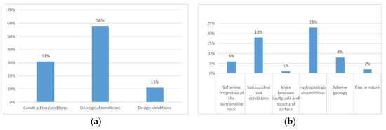 Tunnels are an important part of the world’s transport system today. The construction of tunnels not only relieves the increasing pressure of ground traffic but also overcomes the inconvenience of mountain peaks, rivers and seas, and other terrain and is of great significance in building a faster, safer, and more three-dimensional urban transport network. According to the geographical locations of the tunnels, they can generally be divided into tunnels through mountains, cross-sea tunnels, underground tunnels, etc. According to the statistics of China Statistical Information Network, the main factors affecting the structural stability of mountain tunnels include hydrogeological conditions, construction conditions, and design conditions, among which geological conditions are the dominant factor, accounting for more than half, as shown in Figure 1.