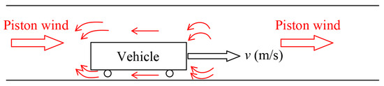 Different from other open space traffic roads, tunnels are narrow and long semi-enclosed spaces. In addition to structural calculations at the initial stage of construction, one also needs to design their internal airflow. Due to the special geometry of tunnels, there exists a special airflow form, namely tunnel piston wind [6,7,8]. When a train is moving fast in a tunnel, air does not flow as smoothly to the back of the train as it does in free space because of the limited space in the tunnel. This allows only part of the air to flow to the rear of the train through the annular space between the train and the tunnel. Most of the air accumulates in front of the train and is constantly squeezed by the front end, with the air pressure gradually rising. Eventually, driven by the train and its emissions, it moves in the direction of the train through the tunnel exit. Accordingly, since the airflow behind the train is in a state of negative pressure, part of the air from the tunnel entrance is constantly introduced into the tunnel, moving in the direction of the train to replenish the air behind the train, as shown in Figure 2. A flow in which none of the physical quantities in the flow field, such as flow velocity and flow rate, characterizing the operational state of the fluid change with time is called a constant flow, and conversely, a non-constant flow [9,10,11,12]. It can be seen that the piston wind is generated with the motion of the train, varies with time until it reaches stability, and changes accordingly with the change of the train’s motion state, so the tunnel piston wind is a non-constant flow.
