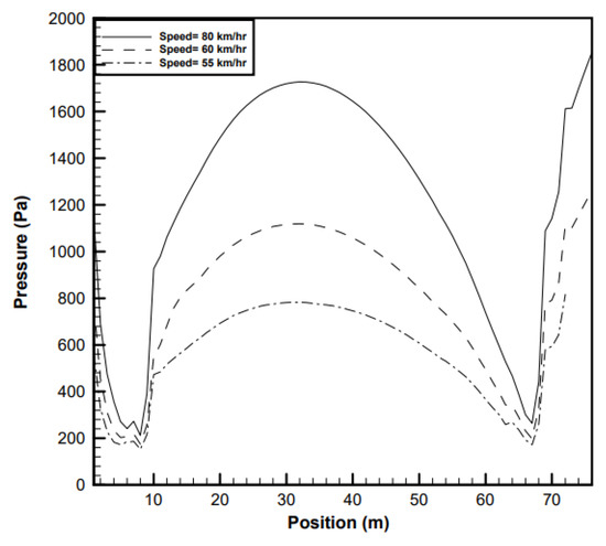 Pressure distribution along distance when the train head arriving the station area under various speeds [29].