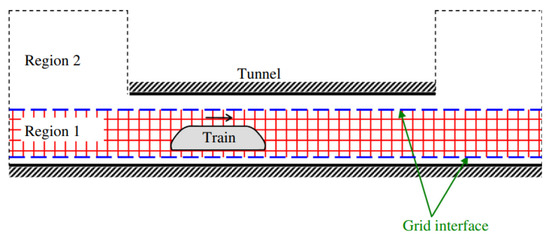 Experimental research is one of the most important methods for studying the flow field of a tunnel motion train and is divided into full-scale experimental research and reduced-size model experimental research. Although full-scale experimental studies can provide the most realistic response to all the characteristics of the research object, they have many difficulties such as expensive, difficult, and dangerous experiments, and restricted experimental conditions. The construction of a tunnel model experimental rig based on similar theories [37,38,39,40] has been widely recognized by scholars at home and abroad. Huang et al. [41] analyzed the effect of piston air and piston air shaft settings on tunnel ventilation effects by numerically simulating the station and comparing it with experimental data. Wang et al. [42] conducted a test study of the metro and monitored the tunnel on both sides of the station for air temperature. The wall surface temperature and wall heat flow density were monitored. The results showed that the heat generated by friction caused a transient increase in air temperature and wall surface temperature when the train passed by, but the piston wind generated also caused a transient increase in wall heat flow density with a large variation. The complex piston wind situation for multi-motor trains operating in tunnels has been less studied. Chu et al. [43] conducted a study for bi-directional tunnels and analyzed the piston wind characteristics when two trains crossed in the tunnel. The principle of the sliding grid method used is shown in Figure 6, and the calculation domain and boundary conditions are shown in Figure 7. Compared to one-way tunnels, bi-directional tunnels have a significantly weaker piston effect due to the increased cross-sectional area of the tunnel. With the increase in tunnel length, multiple trains traveling in the same direction in the same tunnel have emerged, and some scholars have gradually tried to establish a piston wind model for a dual-motion train based on the piston wind model for a single-motion train tunnel [44].