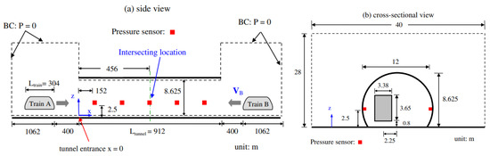 The country’s territory is vast, and its terrain is complex. The construction of tunnels can overcome the difficulties of the terrain and enhance the convenience of transportation. With the rapid growth of the national economy, tunnel construction has gradually accelerated, and China has become the country with the largest number of tunnels and the most complex tunnel system in the world. In the early years of tunnel construction, China focused on developing tunnels through mountains and across the sea, with some of the more iconic tunnel projects being the Dayaoshan Tunnel, the Qinling Tunnel, and the Jiaozhou Bay Cross-Harbour Tunnel. In the 1970s, China’s first metro tunnel was officially opened to traffic, providing a more convenient option for public transport. Due to the limited and complex nature of urban underground space resources, new tunnels are often constructed through existing tunnels, which inevitably generates additional stresses and additional deformations, creating great safety hazards [1,2]. In addition, in order to achieve greater traffic volumes, traffic densities are gradually increasing, departure intervals are being shortened, and tunnels are running multiple trains in the same direction, especially in urban metro tunnels, where urban metro trains run more frequently than inter-city trains and tunnel lengths are gradually increasing. With the development of metro construction, the number of trains running simultaneously in tunnels is bound to increase year after year. The increase in the number of trains traveling in a tunnel makes the tunnel flow field more complex, with important implications for the tunnel environment and disaster prevention [3,4,5].