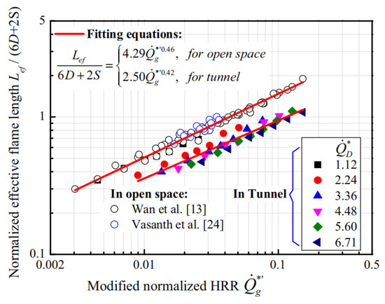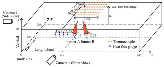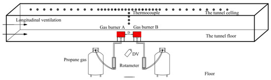 The characteristics of tunnel motion fire are affected by the piston wind generated by train motion, while a moving train fire is a turbulent combustion phenomenon. If only the development law and effective control of fire smoke diffusion are studied, the volumetric heat source model and laminar finite velocity model are not applicable compared with the eddy dissipation conceptual model and component PDF transfer model because the detailed chemical reaction process is not considered. Compared with the eddy dissipation conceptual model and component PDF transfer model, the fast response model consumes less computing resources and has a faster computing speed. In the event of a fire in a moving train in a tunnel, due to the piston wind of the train, fresh airflow from the outside continuously flows into the fire area, generating a large amount of gaseous combustion products and heat as the fire source continues to burn. The fresh airflow into the fire area mixes with the gaseous combustion products and heat to form a high temperature fire smoke stream. Afterwards, the high temperature smoke flows out of the fire zone and heat exchange occurs with the outside world [45,46,47]. Therefore, when evacuating and rescuing a train from a fire in a large tunnel, the wind flow in the tunnel can be considered as a one-dimensional unsteady flow with external heat and mass added, subject to the friction of the tunnel walls and the piston effect of the train, in a turbulent state, and described by a set of partial differential equations for unsteady flow consisting of continuity equations, momentum equations, energy equations, and gas state equations. Huaxian Wan et al. [48]. studied the temperature distribution of ceiling gas and flame support caused by two kinds of interacting energy in the tunnel in order to improve the understanding of the layout of the heat detector and water spraying device. Two identical propane burners are used as energy sources, located in the longitudinal array of the tunnel. The total energy release rate and burner spacing are different. Flame merging probability, ceiling gas temperature, vertical flame height, and longitudinal flame extension length were measured. For the two energy sources in the tunnel, the criterion of flame beginning fusion and flame complete fusion are proposed respectively, and the test device is shown in Figure 8. The results show that the higher the energy release rate, the larger the flame area of the ceiling. The prediction models of roof gas temperature field by two kinds of energy sources are established respectively when the weak plume and the strong plume impact the roof. A modified model considering normalized energy release rate, burner size, and burner spacing is proposed to predict the combination of vertical and longitudinal flame lengths of two burners in a tunnel, as shown in Figure 9.