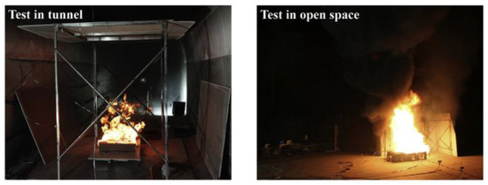 Similar to piston wind test studies, tunnel fire tests are also studied in full-scale and reduced-scale model tests. The simultaneous combustion of two or more independent fire sources is known as the multi-ignition phenomenon, and the combustion behavior of multiple sources differs from that of a single source due to the interaction between them. When the fire sources are close together, a fusion of flames can occur, leading to a regional fire with a significantly higher flame height, which greatly increases the destructiveness and danger of the fire and makes it more difficult to rescue the fire. Therefore, in order to prevent the occurrence of regional fires, a lot of research has been carried out on the problem of multiple fire sources in free space [52,53,54,55]. Multiple-fire source fire accidents can also occur in tunnels due to vehicles colliding with each other and tailgating, etc. However, little research has been conducted on multi-fire source combustion behavior in confined spaces such as tunnels of narrow dimensions. Zhang Yuchun et al. [56] conducted a series of dual-fire source tests in a 1/10 scale model tunnel. The effects of longitudinal ventilation rate, heat release rate, and fire source on the maximum temperature at the top of the tunnel were investigated, and test data on the maximum temperature under dual fire sources were obtained. By comparing with the equations, it was found that the test data could better comply with the equations. The test setup is shown in Figure 10, and the comparison of the test data with equations is shown in Figure 11. A detailed explanation of equations can be found specifically in this article. Qiang Wang et al. [57] also investigated the smoke temperature test in a tunnel without longitudinal ventilation by means of a dual fire source test and developed models for the burner separation distance S and the dimensionless heat release rate Q* and compared the experimental measured data with equations and found that the data were in good agreement. A total of 14 sets of tests on different fire sizes, longitudinal ventilation rates, and tunnel slopes were carried out on model tunnels by Yi L. et al. [58], and temperature profiles and critical rates were derived and discussed. The effect of hydraulic fire suppression systems on combustion products in tunnel fires was also investigated, focusing on carbon monoxide concentration, production, soot production, and visibility [59]. Congling Shi et al. [60] conducted an experimental study of a series of oil pool fires in full-size tunnels and open spaces to obtain mass burn rates and radial temperature distributions of flames, with the test scenario shown in Figure 12. A basic predictive model was first developed using a conventional solid flame model, but it was not very accurate, particularly in open spaces. Then, by comparing the basic prediction model with the measured temperature data, a modified model integrating line of sight factors and other aspects was proposed, and this modified model predicted a temperature rise in good agreement with the experimental data. LIU Chang et al. [13] also investigated the variation of the temperature field and the diffusion of smoke in the tunnel by building a full-size tunnel model. LEI Peng et al. [24] conducted a reduced-scale experiment in a bifurcated tunnel to study the variation of the maximum gas excess. A model to predict the maximum temperature and longitudinal temperature decay below the top of the tunnel was then proposed.