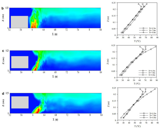 Temperature contours and temperature profiles at critical velocity condition for 1.8 kW fire: (a): no obstacle, (b): obstacle at 0 m from tunnel floor, (c): obstacle at 0.03 m. From tunnel floor 3, (d): obstacle at 0.06 m from tunnel floor [49].