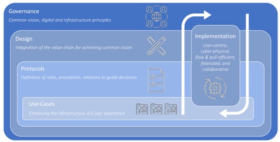 - Bühler, M.M.; Jelinek, T.; Nübel, K.; Anderson, N.; Ballard, G.; Bew, M.; Bowcott, D.; Broek, K.; Buziek, G.; Cane, I.; et al. A new vision for infratech: Governance and value network integration through federated data spaces and advanced infrastructure services for a resilient and sustainable future: Policy brief. In Think20 (T20) Italy 2021-Task Force 7: Infrastructure Investment and Financing; Secretariat T20 Italy: Rome, Italy, 2021; p. 27. [Google Scholar]