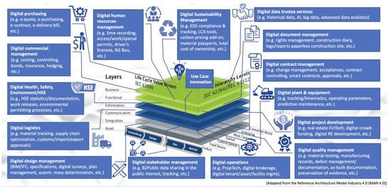 It should be emphasized here once again: Transparent data sovereignty is essential for the development of such a digital platform []. The regulatory framework of the platform therefore plays a decisive role. It can only be created as a cooperative regulatory framework that takes into account the different interests of the players involved in construction and balances out any conflicts of objectives that arise []. The digital transition is also an essential enabler of ecological, circular and low-carbon solutions as well as increased productivity by benefiting and connecting all steps in the building life cycle. However, it should be noted that digitalization is not the goal but one of the means towards a more sustainable and more resilient construction ecosystem [].