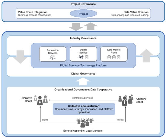 The aim of this conceptual paper is to demonstrate that secure, trusted and sovereign data exchange can be enabled for the construction industry using various governance innovations including a data cooperative legal structure combined with digital federated platforms. Digital platforms have the potential to enhance the level of organization in the construction industry’s value creation systems and increase collaboration among players []. Applied to construction projects, planning and production processes can be much better organized and lead to frictionless, low-waste collaboration. The possibilities of digital platforms go far beyond Building Information Modeling (“BIM”) [,,,]. Digital platforms can therefore be understood as mobilization platforms [,]. They are the digital manifestation of a value network of different stakeholders who want to achieve a common goal [,]. In this case, the common goal is to create a sustainable built environment []. The platform is therefore not only used to map the project structure, but also to organize the structured exchange of data. According to Hagel [], digital platforms therefore consist of an ecosystem with governance structures, i.e., regulatory structures, and a set of standards and protocols to digitally organize interaction in a complex multistakeholder environment. Platforms, therefore, do not replace a traditional project structure, but support and enable it. They form a meta-organization for joint and coordinated action toward a higher-level overall goal with maximum impact. Platforms can provide a process-driven platform approach for more efficient processes in planning and implementation, based on more agile and systemic value chains [].