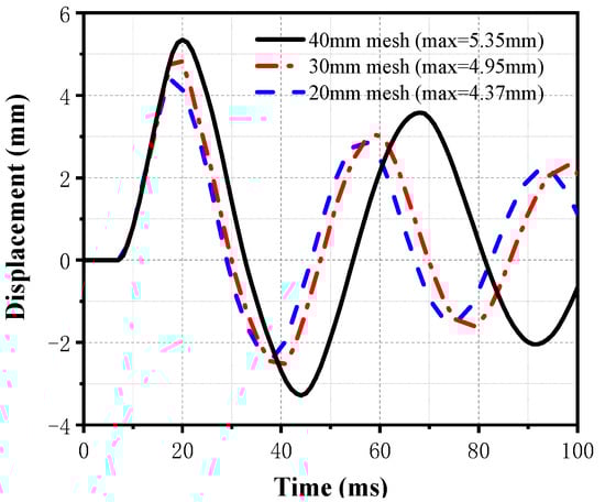 In order to ensure the calculation efficiency, the mortar layer is divided into only one layer of grid in the thickness direction, and the mesh size is in accordance with the brick in the other two directions. The mesh sensitivity analysis is carried out for bricks with mesh sizes of 20 mm, 30 mm and 40 mm on the dynamic response of 230 mm thick wall under the blast scenario with 3.3 kg charge weight and 5 m standoff. The displacement-time histories of the wall center with different mesh sizes and the corresponding peak deflections are shown in