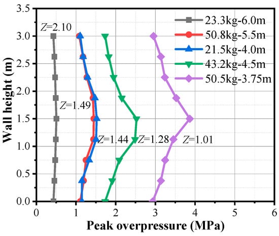 Figure 5 gives the distribution of the peak blast overpressure along the wall height for different blast distant ranges obtained from the simulation. It can be seen from the figure that the maximum peak overpressure at the wall occurs at the center of the wall along the wall height when the scaled standoff Z is 2.10, which is about 18% higher than the minimum peak overpressure at the wall, but this difference can increase to 32% as the scaled standoff decreases to 1.01. It shows that the overpressure distribution on the wall under the far-range explosion is relatively uniform, and the uniformity of distribution increases with the increase in the scaled standoff.