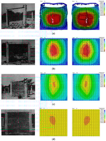 Figure 6. By comparing with the test data, the simulation obtained a considerably ideal overall damage pattern of the wall. Under the level A damage, the wall shows severe deformation in a large area and produced several large cracks near the four edges of the front surface and the middle of the back, the displacement of the center of the wall was dispersed, and the wall collapsed; under the level B damage, the large deformation was mainly concentrated in the center of the wall and produced main cracks near the four edges and the middle of the back; under the level C damage, the wall deformation is small, and only minor cracks are produced on the wall; Level D damage shows subtle deformation on the wall, and the wall still retains good integrity.