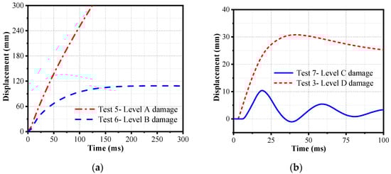 Figure 7, it can be seen that: (1) the displacement-time histories at the wall center under the level A damage is diverging, which indicates that the wall has undergone integral damage and no longer has the ability to resist the external load locally, and finally collapses; (2) under the level B damage, although the center displacement of the wall is not diverging to the wall further damaged, large deformation occurs without rebound, which leads to possible local damage to the wall; (3) under level C damage, the wall center displacement is larger, and the occurring of rebound eventually produces relatively large residual deformation; (4) under level D damage, the displacement at the wall center is the smallest, and the wall occurs elastic dynamic response with a certain residual deformation, but much smaller than level C damage.