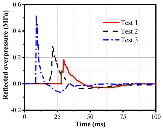 According to the above formulas, the peak reflected overpressures in the three blast tests were calculated to be 0.18 MPa, 0.29 MPa and 0.52 MPa, respectively, and the overpressure-time histories are shown in