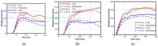 Figure 11 compares the displacement-time histories curves at the wall center obtained from the simulation and the test. It is easily seen that relatively accurate peak displacements at wall center were obtained using FE simulations for all three tests, with an overall deviation range from 5.8% to 18.9%, for either 6 in. or 8 in. wall thickness grouted CMU MIWs. However, the deflections at the wall center obtained from the simulations were generally smaller than the experimental results, which may be related to the deviation in estimating the peak overpressure of blast loading using the theoretical formulas.