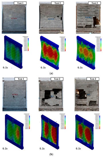 Figure 12 further compares the damage pattern of the wall obtained from the simulation at 0.2 s with the final damage pattern of the wall in the test. It can be seen that the overall damage pattern of the wall obtained from the simulation is consistent with the experimental results. Part of the grouted CMU MIW underwent overall unidirectional bending damage and local damage was mainly concentrated at the end and non-grouted block sections. However, for the local damage of the wall, the numerical simulation results deviated from the experimental results to some extent, which was mainly related to the limitation of the simplified load application method in the simulation.