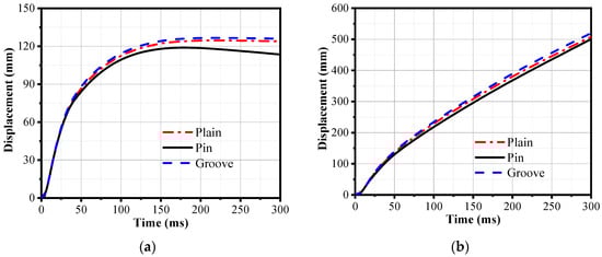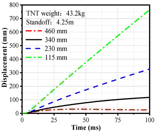 Figure 18 shows the simulated dynamic response of a 3 m × 3 m MIW of different thicknesses for a 43.2 kg TNT charge at a blast distance of 4.25 m (