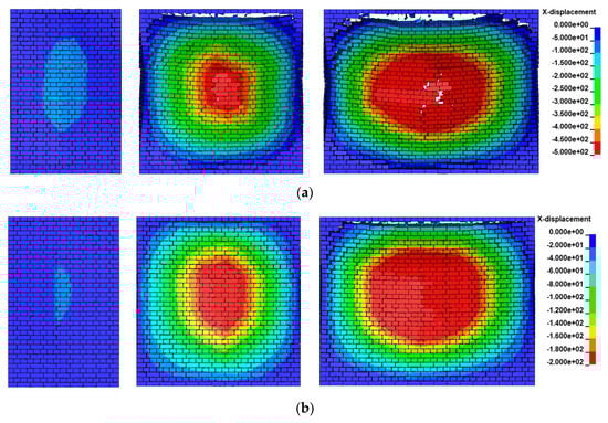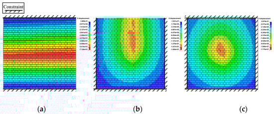 Figure 14 shows the final damage pattern of the wall under these three different boundary constraints. It can be seen that with the change of boundary constraints, the damage pattern of the wall changes significantly. With the weakening of the constraint, the large deformation region is mainly shifted to the unconstrained boundary, while the damage region where large deformation occurs increases.