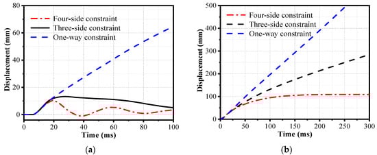 Figure 15 gives the displacement–time histories of the wall center under different constraint conditions. It can be clearly seen that the maximum deflection at the wall center increases rapidly with the weakening of the boundary constraint, and the corresponding damage level of the wall changes. As for the scenarios with