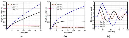 Figure 17 further gives the displacement-time histories at the wall center under three different blast loads. It can be seen that the damage of the wall is most severe in the case of 4 m × 3 m, while it is least severe in the case of 2 m × 3 m. The reason is that the four-sided constrained boundary conditions, the damage develops mainly along the short side. In the 2 m × 3 m case, the short side is of 2 m, thus the span is reduced, and the final degree of damage is weakened; in the 4 m × 3 m case, although the wall height is still 3 m, but with the increase in width, the wall gradually develops to a 3 m span of the one-way constrained plate, with the weakening of the constraint, the degree of damage intensified.
