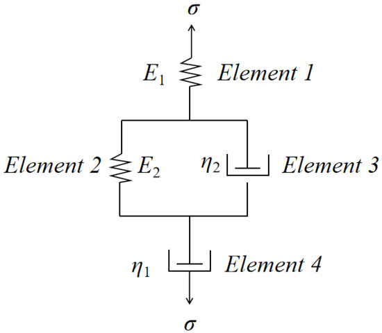 The deformation process of viscoelastic materials changing with time mainly includes creep, stress relaxation, hysteresis, and strain rate sensitivity. In engineering, viscoelastic basic elements (springs and dampers) are often combined into different viscoelastic mechanical behavior models in different ways to describe their creep deformation characteristics. It is generally believed that the Burgers model can best reflect the creep and relaxation characteristics of asphalt composite concrete, so the Burgers model viscoelastic constitutive model is widely used in the field of road engineering [38,39,40,41]. The Burgers model is composed of two springs and two dampers. As shown in Figure 3, the Burgers model can better reflect the viscoelastic deformation characteristics of asphalt composite concrete materials.