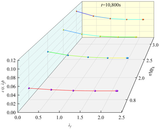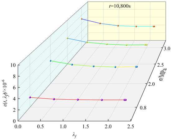 The creep strain time data gathered in the test is imported using Origin 8.5 software’s nonlinear fitting approach in accordance with the results of the creep test. By assuming the beginning values of the model parameters and altering the model parameters to make the theoretical calculation results of the model best fit the experimentally measured values, the parameters of the viscoelastic mechanical behavior model based on Equations (1) and (2) are established. The impacts of Vf and Ra on model parameters are examined in light of this. The creep equation and constitutive equation are used to perform the viscoelastic analysis of fiber-reinforced asphalt composite concrete. The constitutive equation of fiber-reinforced asphalt composite concrete is established by using the parameter λf as the parameter comprehensively reflecting the influence of Vf and Ra.